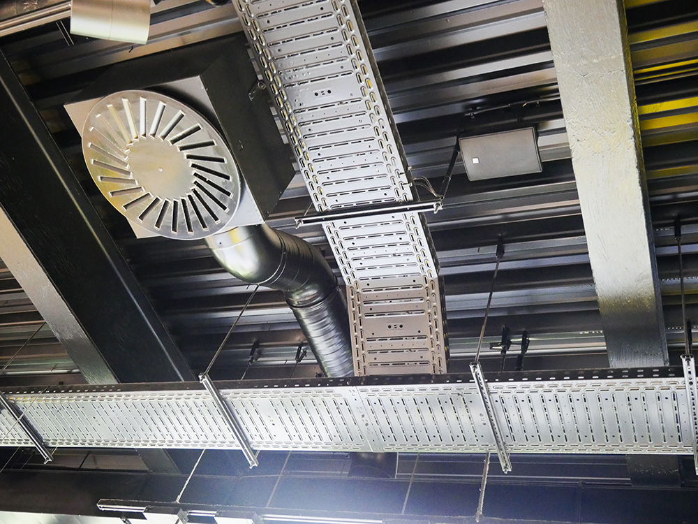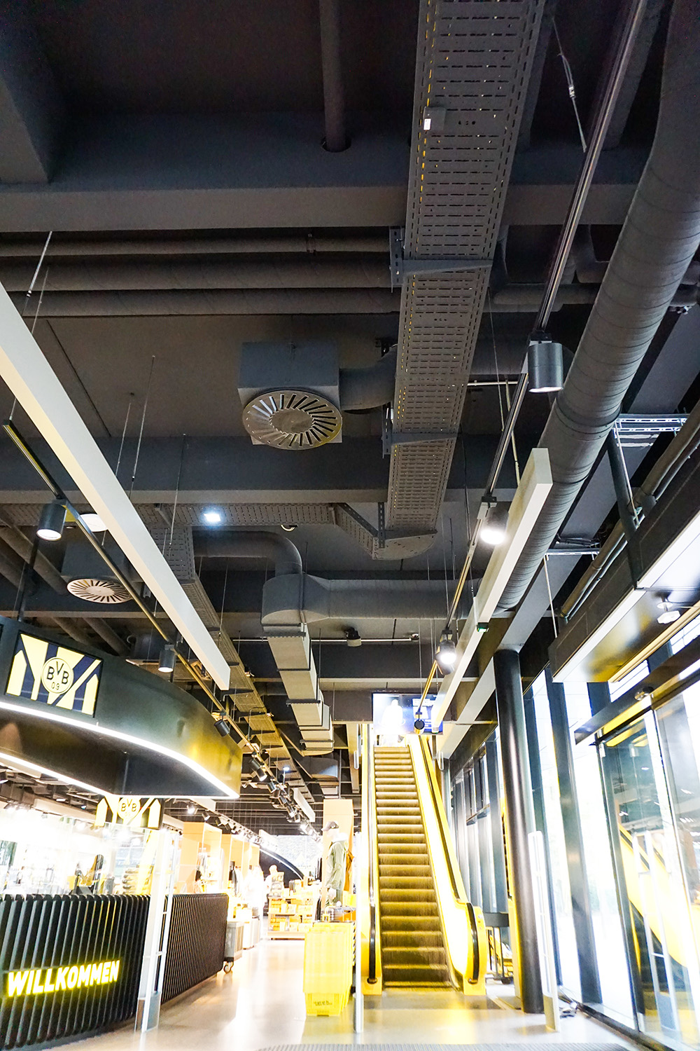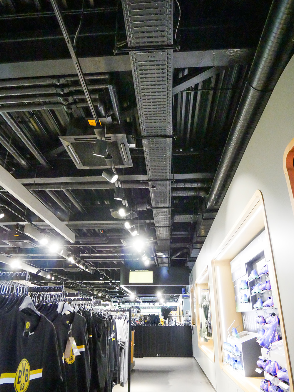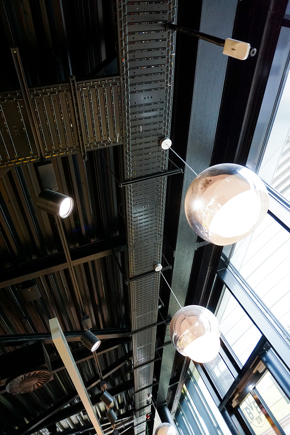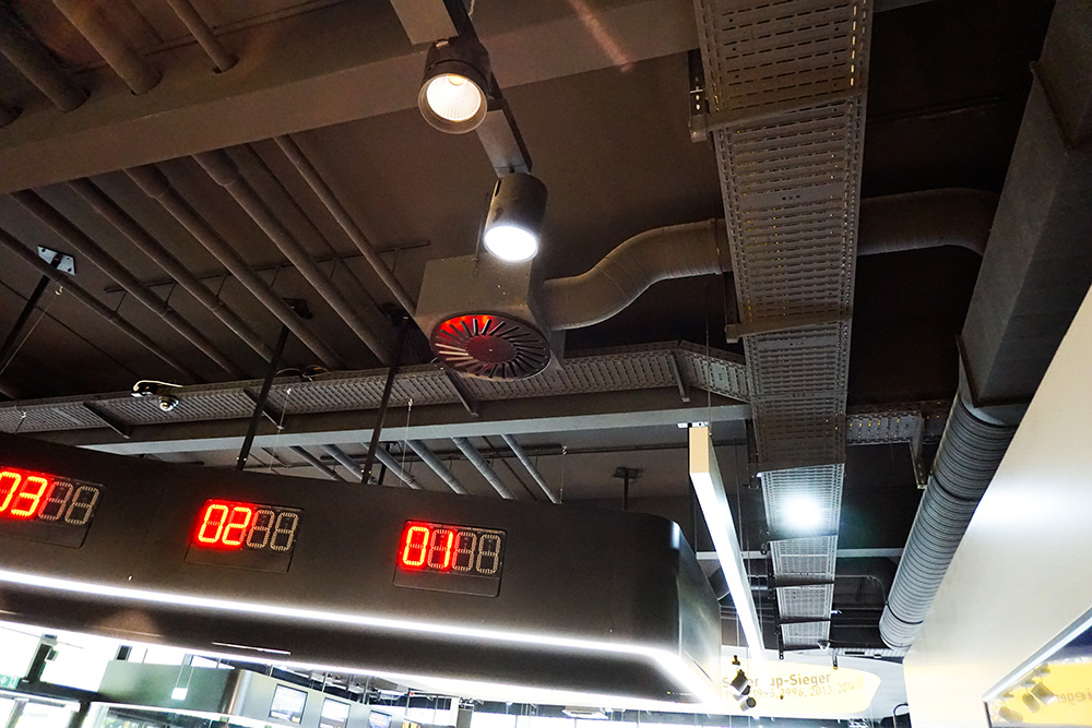 Im Inneren der BVB-FanWelt trifft Holz auf Konstruktionselemente wie Stahl und sichtbare Versorgungsrohre. Das sorgt für einen industriellen Charakter, der zu Dortmund passt und zur OBO BlackLine. Mit den Systemlösungen für schwarze Aufputz-Installationen lassen sich in modernen Architekturprojekten anspruchsvolle Elektroinstallationen realisieren. Zum Portfolio zählen unter anderem Geräteeinbau- und Leitungsführungskanäle, Unterflurlösungen und Kabelrinnen. In der BVB-FanWelt wurden schwarze Kabelrinnen, Hängestiele und passende Formteile gut sichtbar in den Innenräumen installiert, wo sie sich harmonisch in den Industrial Style des Interieurs einfügen.