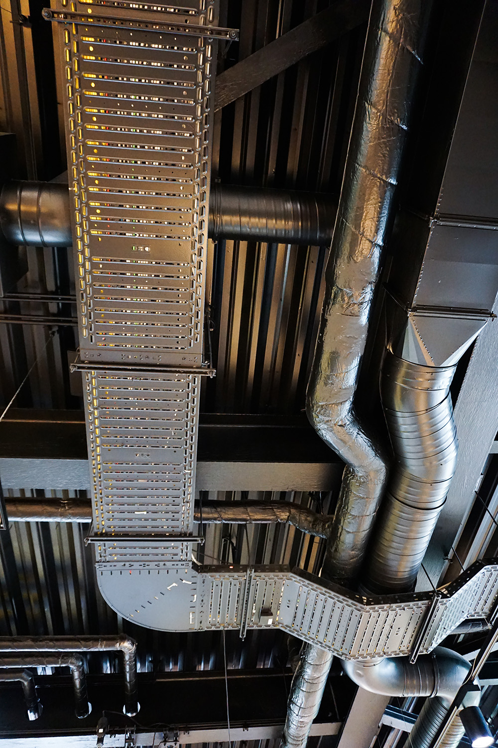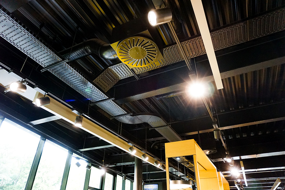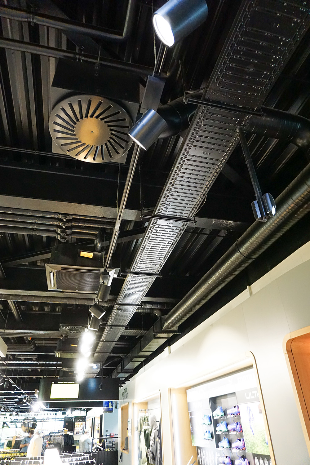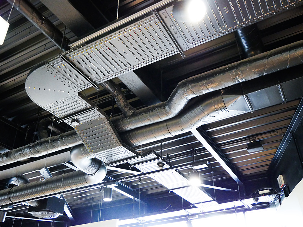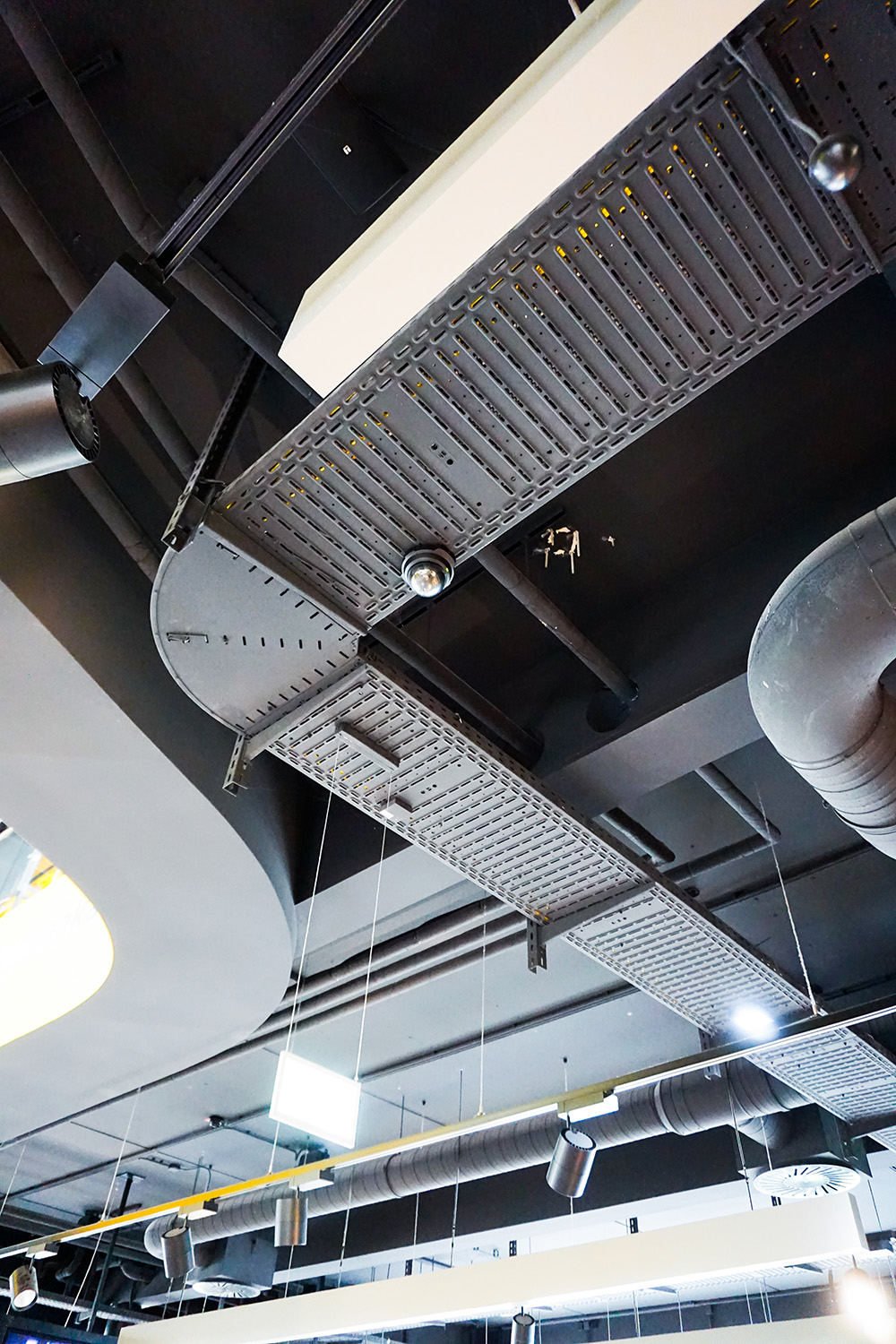 Im Inneren der BVB-FanWelt trifft Holz auf Konstruktionselemente wie Stahl und sichtbare Versorgungsrohre. Das sorgt für einen industriellen Charakter, der zu Dortmund passt und zur OBO BlackLine. Mit den Systemlösungen für schwarze Aufputz-Installationen lassen sich in modernen Architekturprojekten anspruchsvolle Elektroinstallationen realisieren. Zum Portfolio zählen unter anderem Geräteeinbau- und Leitungsführungskanäle, Unterflurlösungen und Kabelrinnen. In der BVB-FanWelt wurden schwarze Kabelrinnen, Hängestiele und passende Formteile gut sichtbar in den Innenräumen installiert, wo sie sich harmonisch in den Industrial Style des Interieurs einfügen.