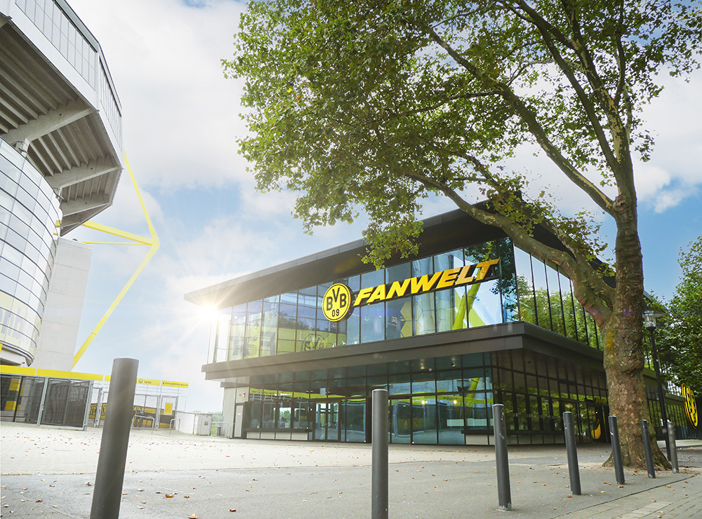 Die BVB FanWelt als zentrale Anlaufstelle für alle Borussia Dortmund Fans verfügt über eine direkte Anbindung an das Stadion und an die B1. Eine verglaste Fassade gibt Einblicke in die schwarz-gelbe Fanwelt, schon von Weitem sind das sechs Meter hohe BVB-Logo und der Borussia Dortmund Schriftzug zu erkennen. Das Gebäude spiegelt Transparenz, Nähe und Zugänglichkeit wieder – wichtige Werte für den BVB und die Region.