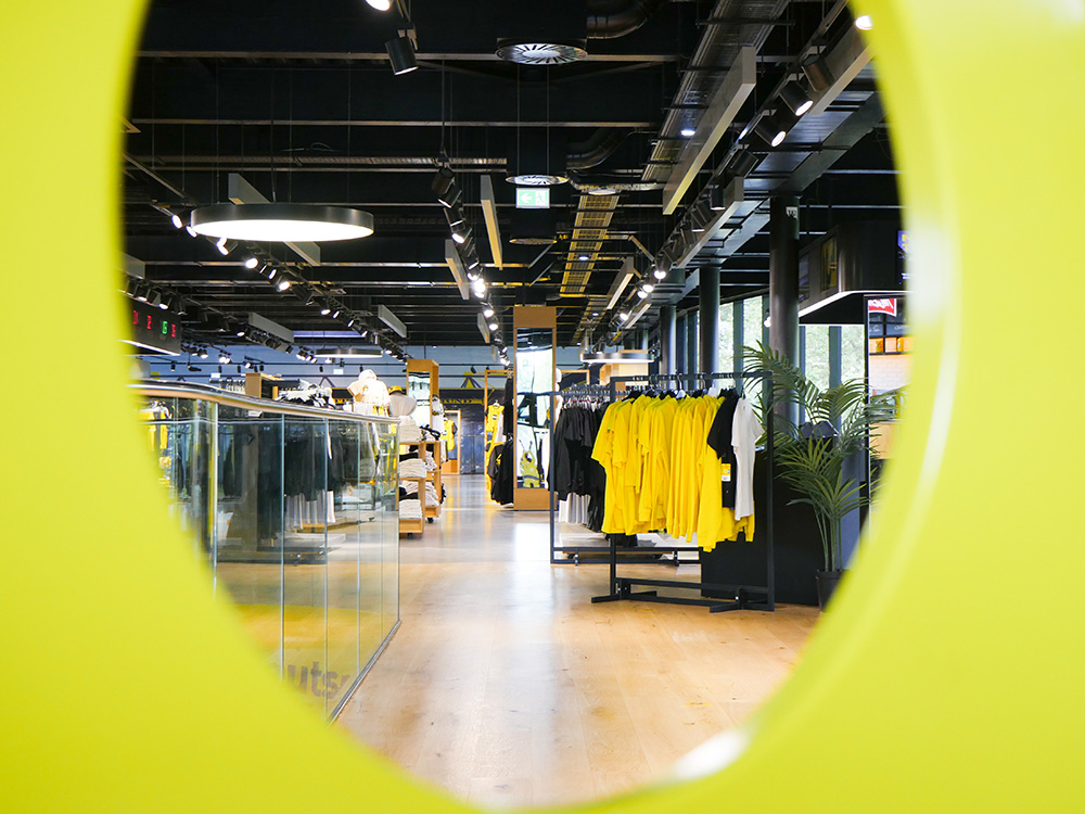 Die BVB FanWelt in Dortmund vereint auf über 2.000 Quadratmetern Fläche viele Fanangebote des schwarzgelben Vereins unter einem Dach: Merchandising, Services und ein Café. Ein weiteres Highlight ist die sogenannte Beflockungsstation, an der Fans ihr eigenes Trikot bedrucken lassen können.