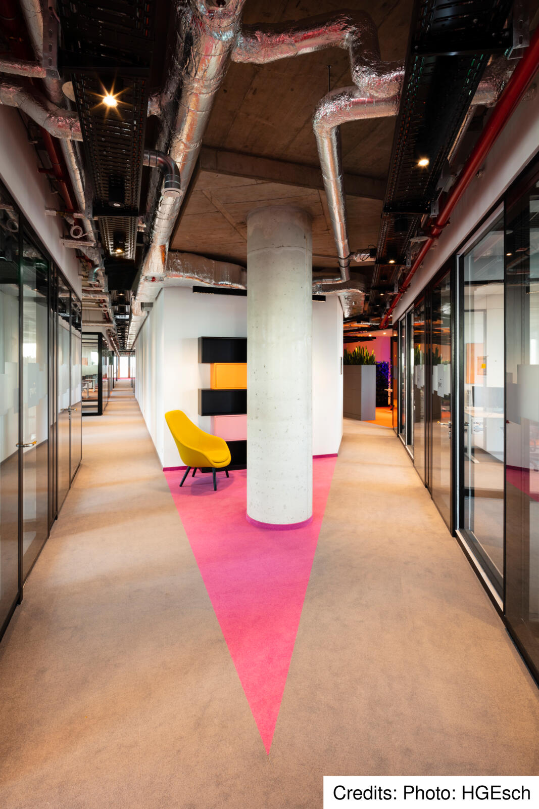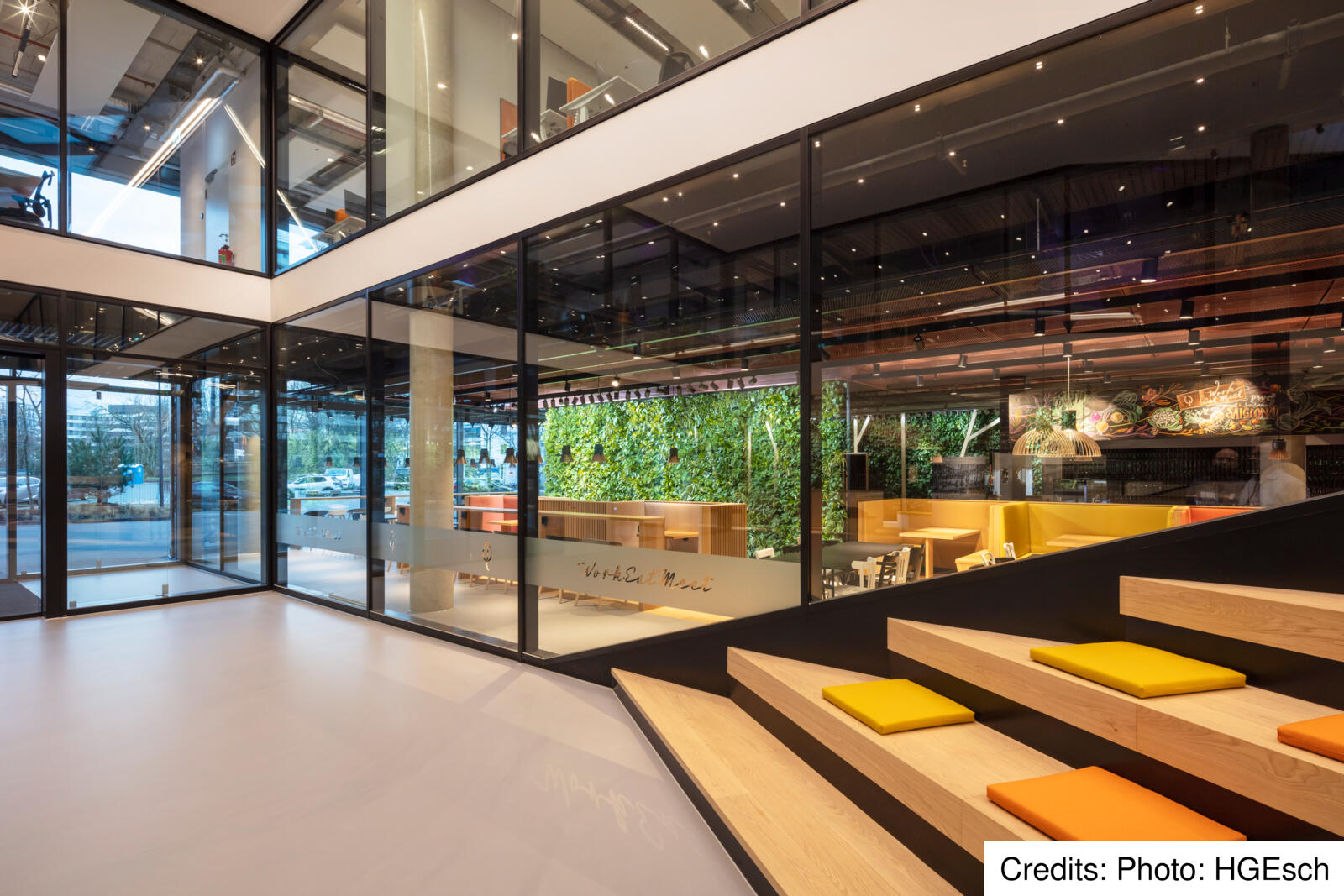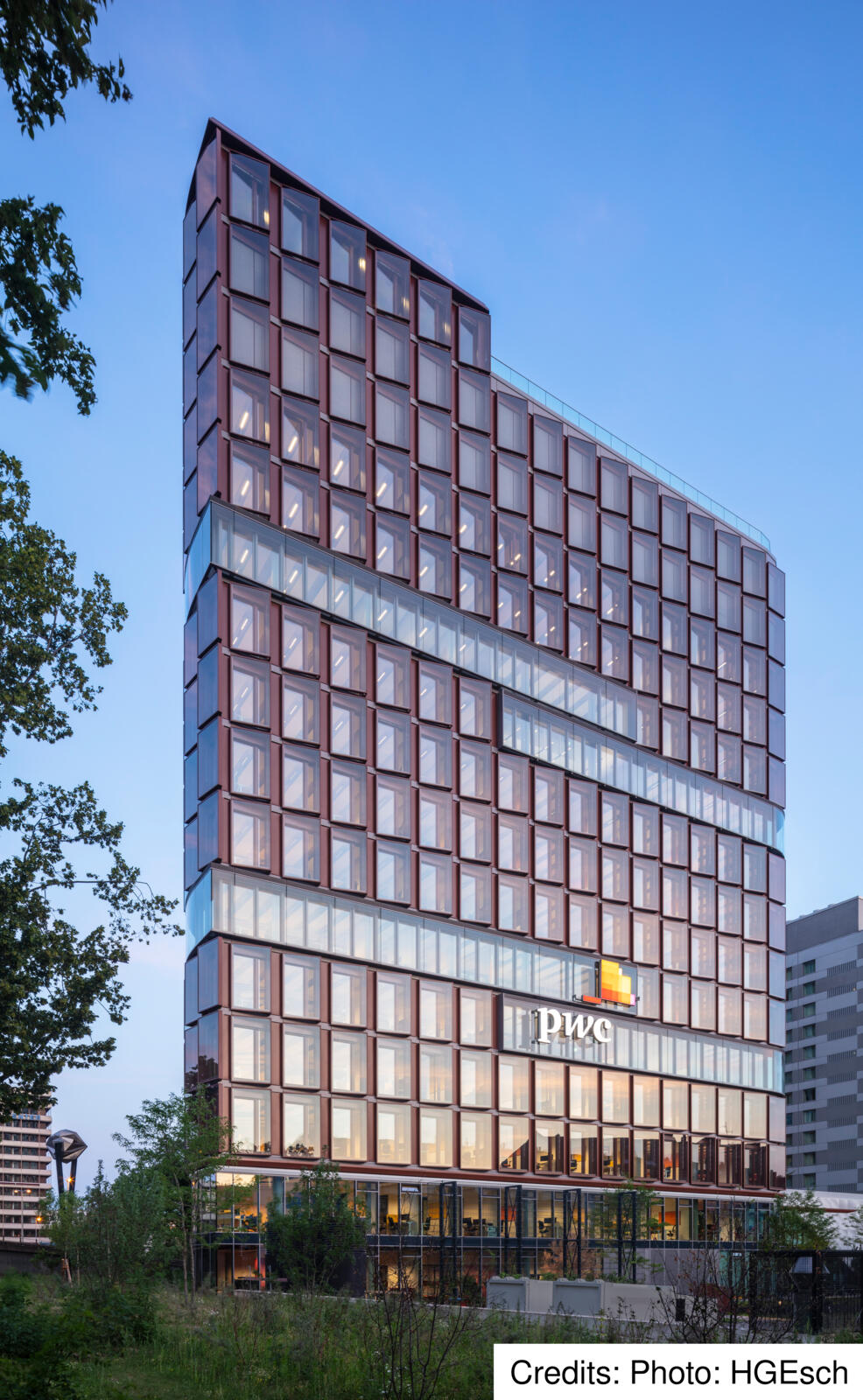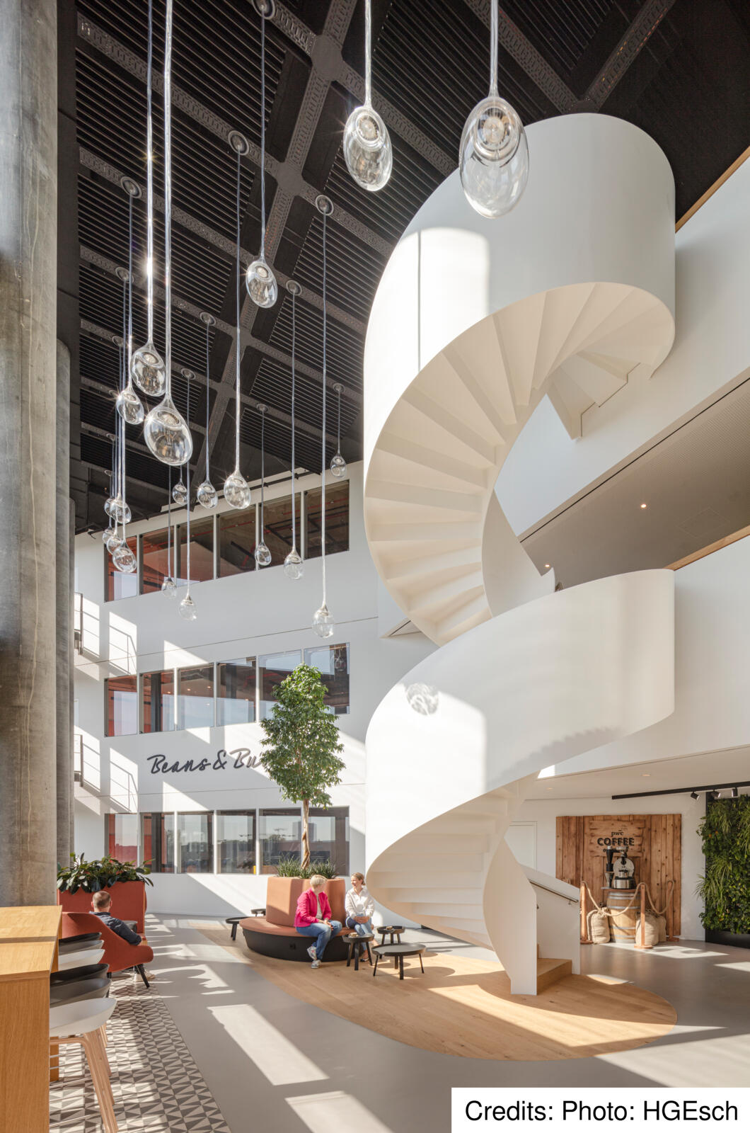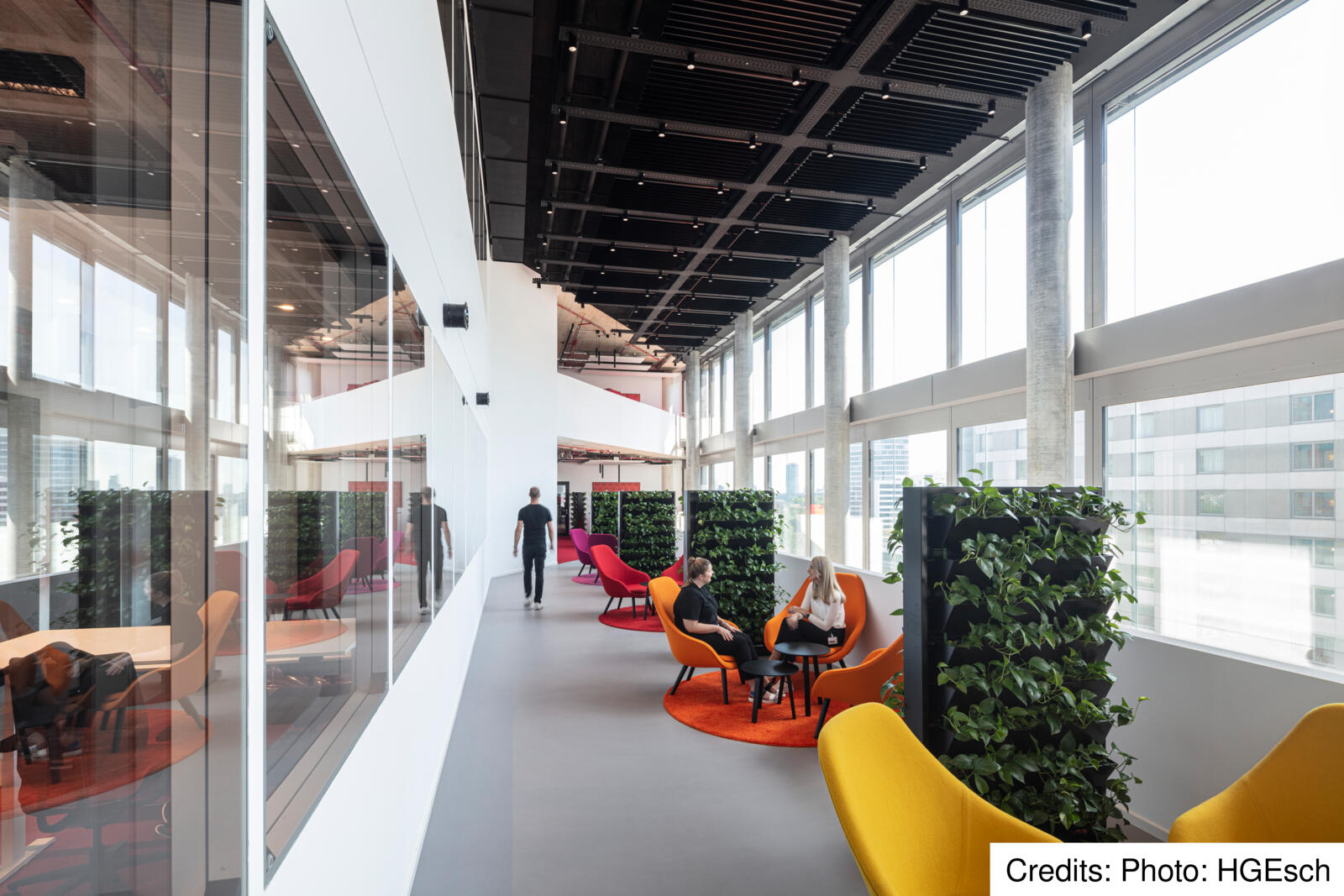 Due to the location of Eclipse, surrounded by two intersecting federal roads with high noise levels in the outdoor area, the common areas for the users of the Eclipse offices are located mainly inside the building. The centrepieces are the atria and light wells, which are located on several floors and, in some cases, extend over three floors. In these atria, employees will find a wide range of recreational areas, such as a cafeteria and an event hall, which can be seen clearly through the glass of the façade also from the outside. Where the flat window surfaces can be seen through the glass façade, the atria connect to form a “vertical campus” that extends to the roof terrace with a sweeping view over the city. “The Eclipse acts as a communicator and creates an urban connection between the neighbourhood and the world of work,” says Werner Sübai, Senior Partner at HPP Architects. Sustainability also played a major role in the construction of the building.