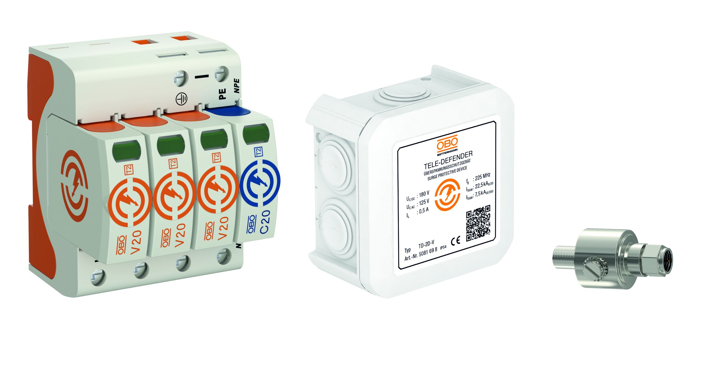 The two promotional packages for surge protection contain either two or three devices, and are available at a special price from participating electrical wholesalers. The devices comply with all requirements of the VDE for surge protection devices. The packages contain a type 2 V20 arrestor for increased safety requirements, a Tele Defender to protect telecommunication systems and an optional DS-F M/F data cable protection device for TV and satellite systems, multiswitches and receivers, as well as DVB-T(2). This provides equal protection for cables for power supply, telecommunications and the TV cable feed, as all of these cables can be damaged by surge voltages.