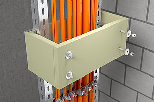 The new, three-sided empty housings of the ZSE90 can be used for rising sections on the wall, vertical single-clip installations and cable installations on profile rails. In addition, the four-sided variant offers the option of strain relief for suspended rising sections for the maintenance of electrical function. Here, the non-combustible housing is mounted and filled on the side rails of the rising section using a matching lock plate and appropriate mounting set. The suspended rising section is enclosed on all sides, reliably preventing a fire load on the clips.