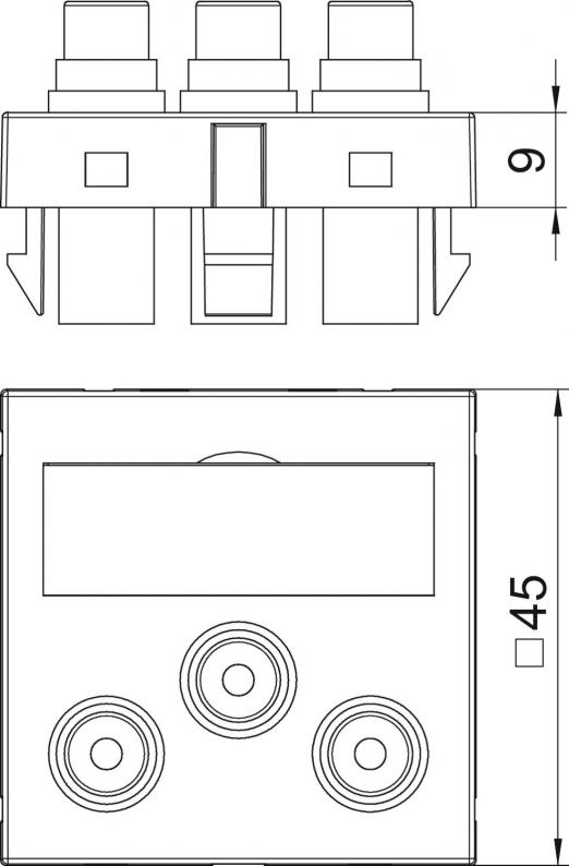 Multimedia support with three cinch connection sockets for audio/video, straight cable outlet, with labelling panel, three cinch couplings (RCA), socket-socket version, colour coding yellow/red/white. Support plate with locking fastening, suitable for horizontal and vertical installation in the system environment.