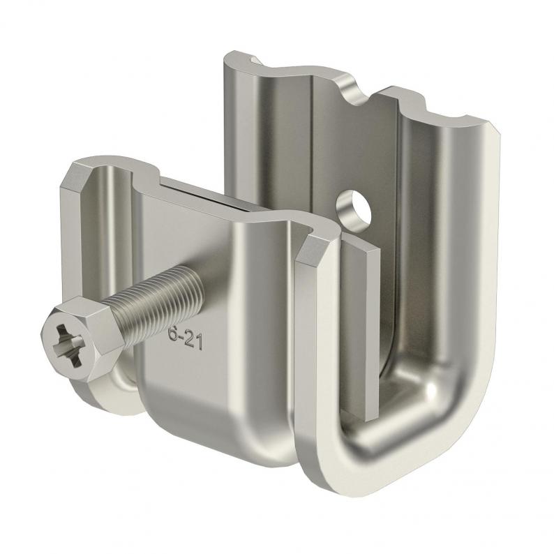 This type of support clamp is pushed onto the support and fixed to the girder or flat iron using a pressure trough and bolt (M8).The hexagonal bolt has a WAF of 10 mm.In the clip element also two more M8 threads are introduced, for example to attach threaded rods.