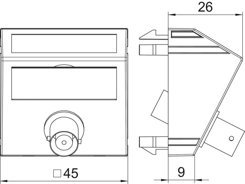 Multimedia support with one BNC connection socket, slanting cable outlet, with labelling panel, BNC coupling, socket-socket version. Support plate with locking fastening, suitable for horizontal and vertical installation in the system environment.