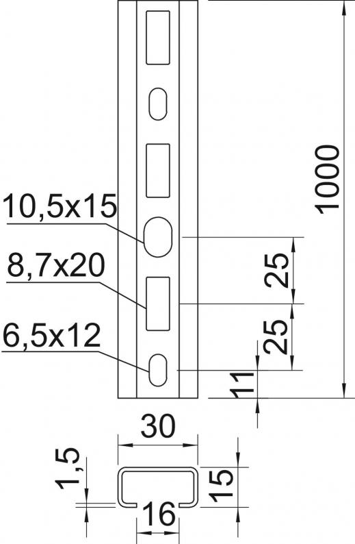 Profile rail, perforated, slot width 16 mm.