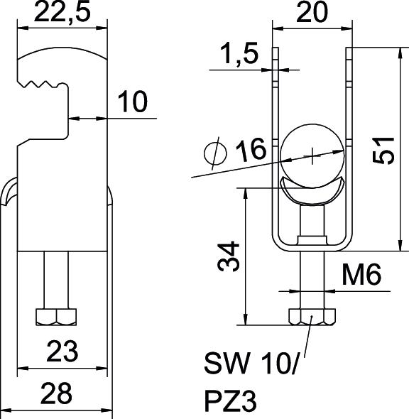 Clamp clip with F-foot, metal pressure sleeve with rounded edges to protect the cable. For vertical and horizontal mounting of 1 single cable on flat bars. With 1-start screw thread on pressure sleeve, universal hexagonal screw head WAF10, with slot and cross recess. Suitable for assembly indoors and outdoors. We recommend the use of a counter-sleeve.