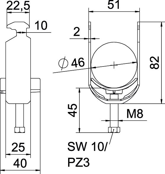 Clamp clip with hammerhead foot, plastic pressure sleeve made of polypropylene. For vertical and horizontal mounting of 1 single cable on a C-profile rail. For a slot width 16–17 mm. With 1-start screw thread on pressure sleeve, universal hexagonal screw head WAF10, with slot and cross recess. Suitable for assembly indoors and outdoors. We recommend the use of a counter-sleeve.