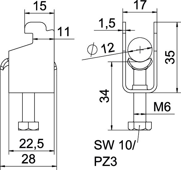 Clamp clip with N-foot, metal pressure sleeve with rounded edges to protect the cable. For vertical and horizontal mounting of 1 single cable on a C-profile rail. For slot width 11‒12 mm With 1-start screw thread on pressure sleeve, universal hexagonal screw head WAF10, with slot and cross recess. Suitable for assembly indoors and outdoors. We recommend the use of a counter-sleeve.