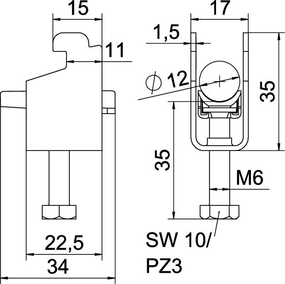 Clamp clip with N-foot, plastic pressure sleeve made of polypropylene. For vertical and horizontal mounting of 1 single cable on a C-profile rail. For slot width 11‒12 mm With 1-start screw thread on pressure sleeve, universal hexagonal screw head WAF10, with slot and cross recess. Suitable for assembly indoors and outdoors. We recommend the use of a counter-sleeve.