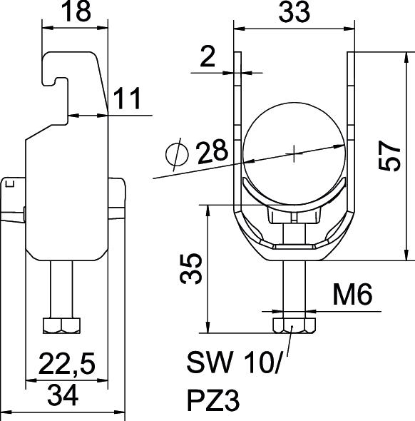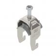 Clamp clip with U-foot, plastic pressure sleeve made of polypropylene. For vertical and horizontal mounting of 1 single cable on a C-profile rail. For slot width 18–22 mm. With 1-start screw thread on pressure sleeve, universal hexagonal screw head WAF10, with slot and cross recess. Suitable for assembly indoors and outdoors. We recommend the use of a counter-sleeve.