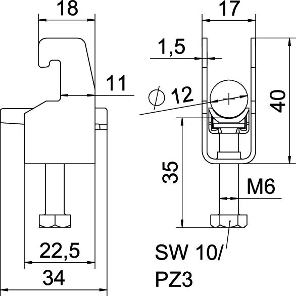 Clamp clip with U-foot, plastic pressure sleeve made of polypropylene. For vertical and horizontal mounting of 1 single cable on a C-profile rail. For slot width 18–22 mm. With 1-start screw thread on pressure sleeve, universal hexagonal screw head WAF10, with slot and cross recess. Suitable for assembly indoors and outdoors. We recommend the use of a counter-sleeve.