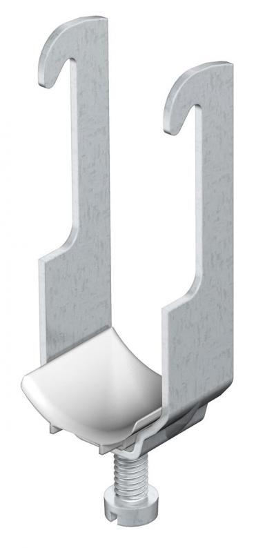 Also suitable for angular steel of 40 mm shaft length; aluminium ALMg3 clip and bolt, polypropylene pressure trough, halogen-free, colour light grey RAL 7035.