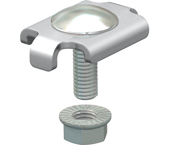 Hold-down clamp for fixing mesh cable trays to wall or support brackets.