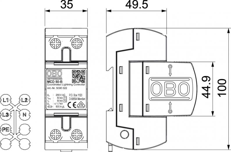• Lightning current arresting capacity to 50 kA (10/350) per pole and up to 150 kA (10/350) in total