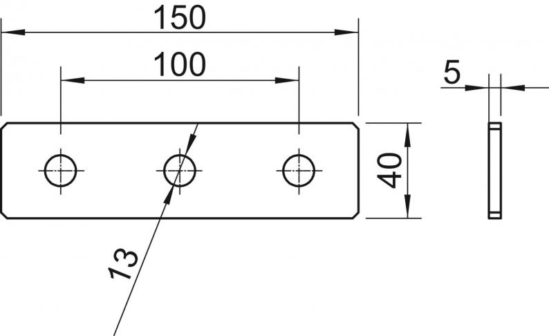 Connection plate with three holes for straight connection of profile rails 41 x 41 mm and 41 x 21 mm.