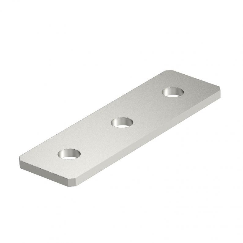 Connection plate with three holes for straight connection of profile rails 41 x 41 mm and 41 x 21 mm.