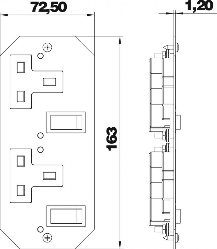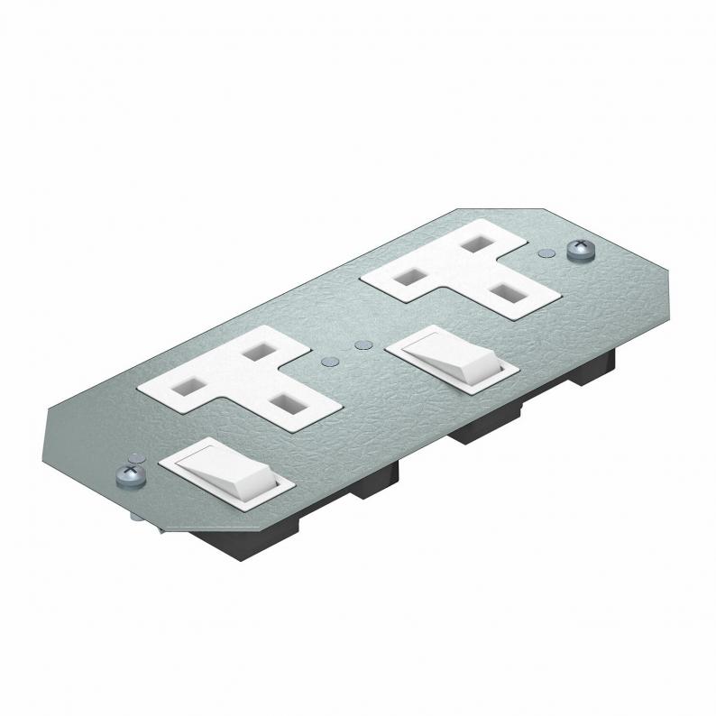 Cover plate with two switched single sockets for installation in mounting supports beneath GES service outlets and cassettes. Sockets with increased contact protection with screw connection, 3-pole, 13 A, 250 V~, corresponds to BS 1363.