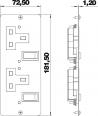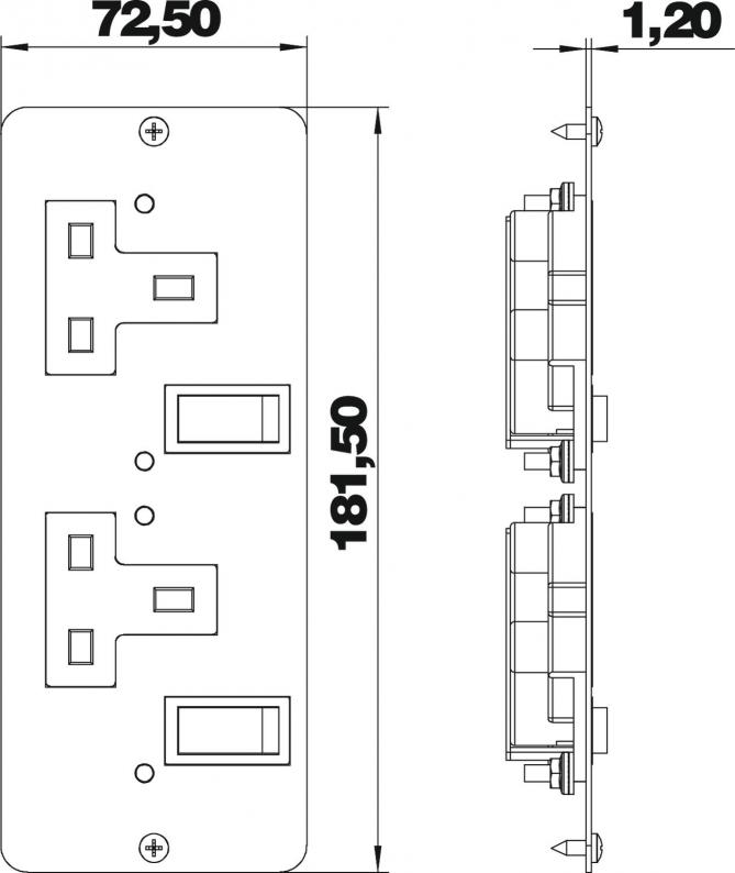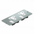 Cover plate with two switched single sockets for installation in mounting supports beneath GES service outlets and cassettes. Sockets with increased contact protection with screw connection, 3-pole, 13 A, 250 V~, corresponds to BS 1363.