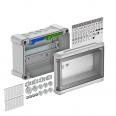 Distribution box with terminal strip for surface mounting, for the current sub-distribution in interior and exterior areas, in accordance with IEC 439-3. With pre-mounted 35 mm hat profile rail. IP66 protection type and IK08 protection rating. Transparent cover to screw on, with cut-out.