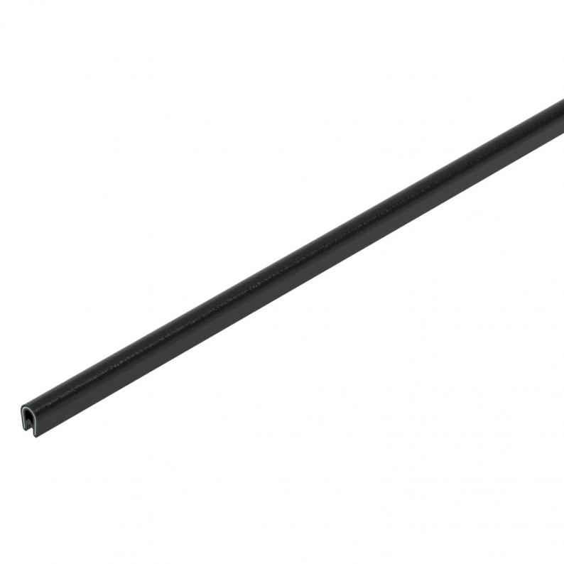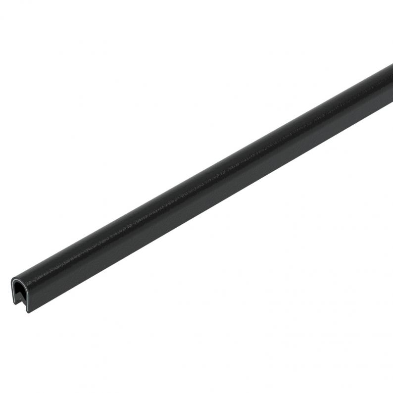Edge protection strip with steel core for covering cut metal edges. Black version, UV-resistant.