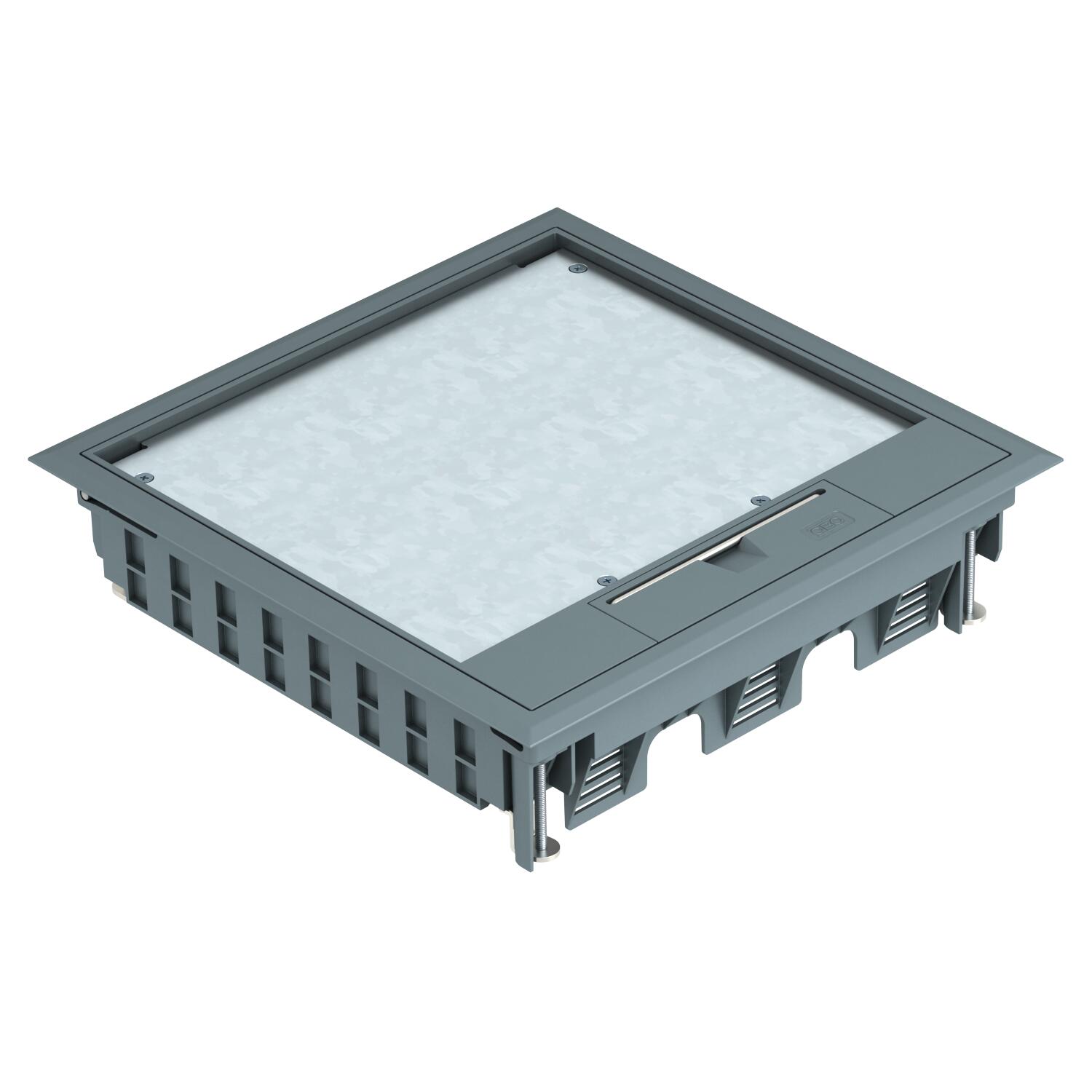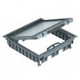 Service outlet with handle clamp, 3-compartment, for the installation of MT9 mounting support. Three type APMT5 cover plates can be installed. Floor covering recess in the hinged cover pre-adjusted to 5 mm, if necessary adjustable to 10 mm.