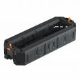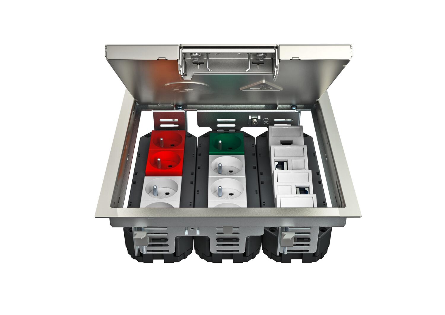 Service outlet with handle clamp for up to 12 individual Modul 45 devices in 3 UT4 universal supports, use in trunking systems and system floors for indoor use.