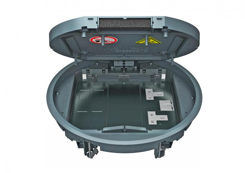 Service outlet with locking slider for up to 12 individual Modul 45 devices in 3 UT4 universal supports, use in duct and trunking systems and system floors.