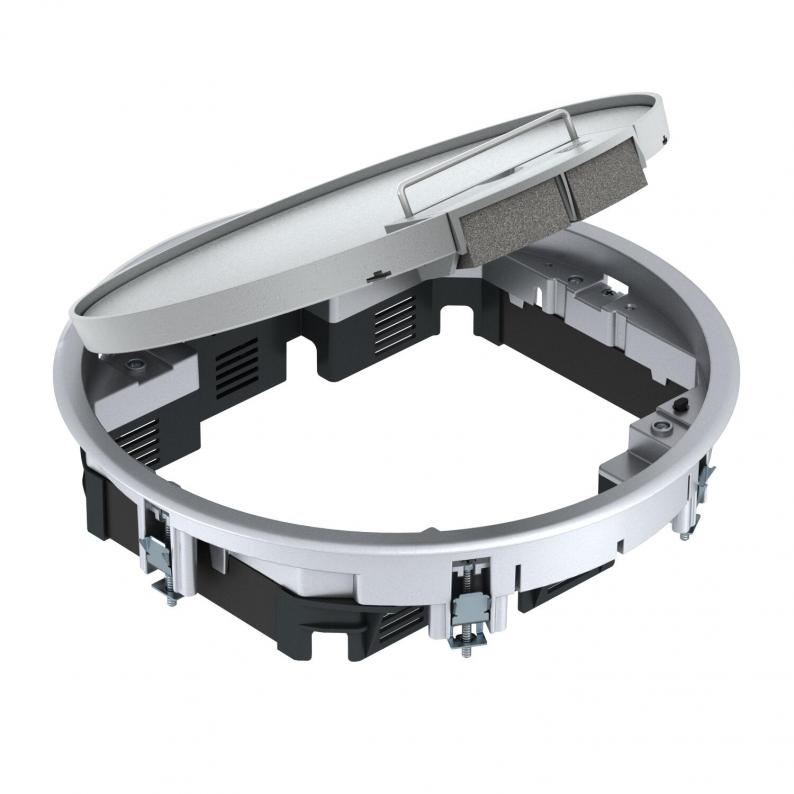 Service outlet with handle clamp for up to 10 individual Modul 45 devices in 2 UT3 and one UT4 universal support, use in duct systems and system floors for indoor use.
