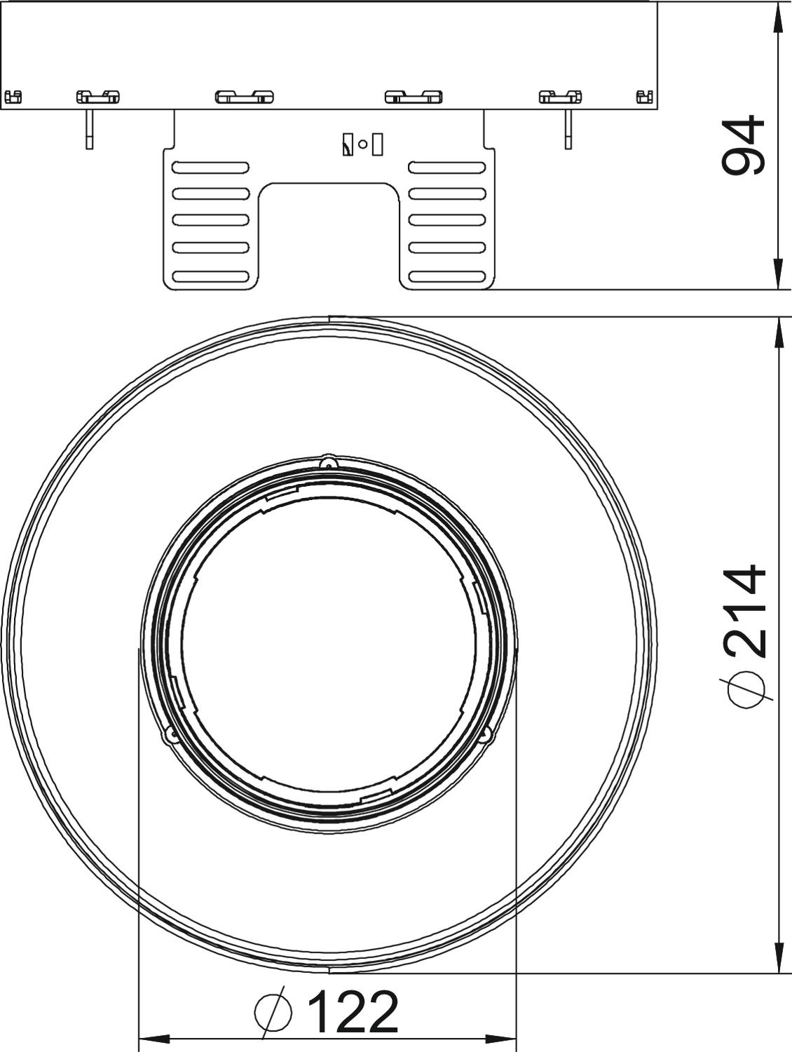 Height-adjustable cassette, decoupled from the floor, of nominal size R4, for tube bodies, for the installation of accessories in dry or wet-cleaned floors for indoor use, for mounting in underfloor boxes UZD250-3 or UZD350-3, either in conjunction with a mounting lid DUG..R4 or in UGD250-3R4 or UGD350-3R4. Mounting takes place using height adjustment brackets (order separately) in the aluminium frame profile of the underfloor boxes.