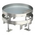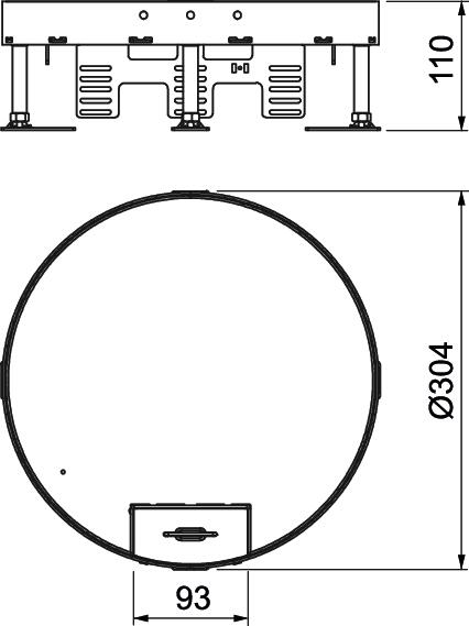 Height-adjustable round cassette, 3-compartment, with cord outlet of nominal size 9 for the installation of accessories. Cassette suitable for the use in trunking systems, raised and cavity floors in dry- and wet-cleanded floors in indoor areas. Suitable only for smooth floor coverings.