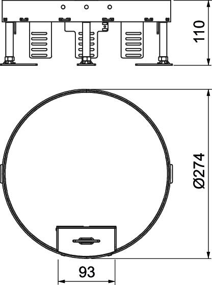 Height-adjustable cassette for cord outlet, 3-compartment. 2 APMT2 cover plates and 1 APMT5 cover plate can be installed. For the installation of 2 UT3 universal supports and one UT4 universal support for 7 individual installation devices with support ring/support clamp or 10 Modul 45 devices.