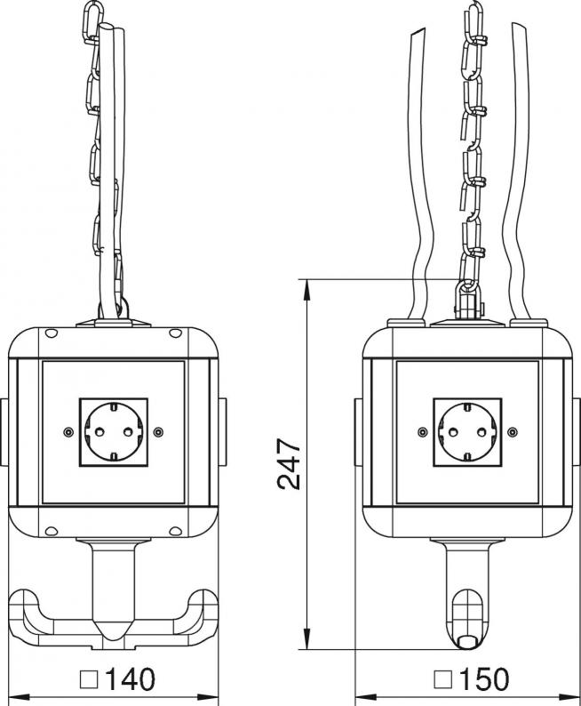 Equipped as follows: 4x single protective contact sockets 16 A/250 V with increased touch protection, prewired for two AC currents, connection via 2x 3-pin terminals, 1x CEE socket 16 A/415 V, with partition for circuit separation.