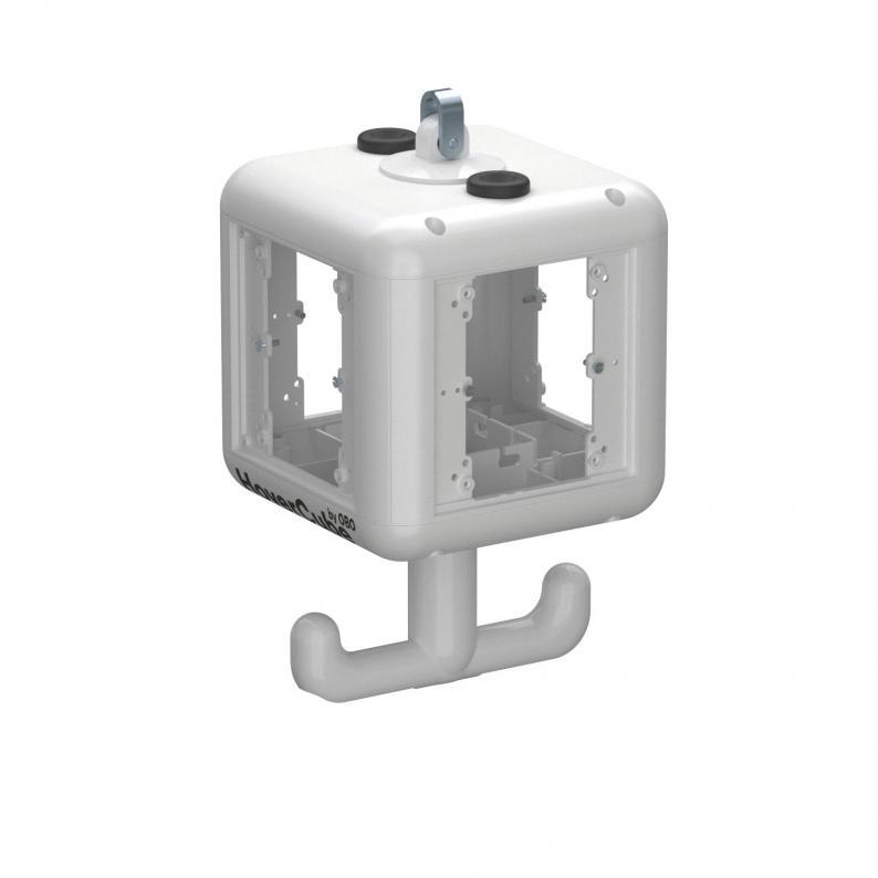 Empty housing with suspension lug and grip hook, for the installation of four electrical resources, with included partition. Without cover plates.
