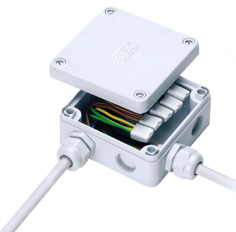 Nemli ortam dağıtım kasası, halojen içermeyen iki farklı plastik bileşenden oluşmaktadır, zemin bölgesinde delme membranı ile (15 mm kablo çapına kadar).
