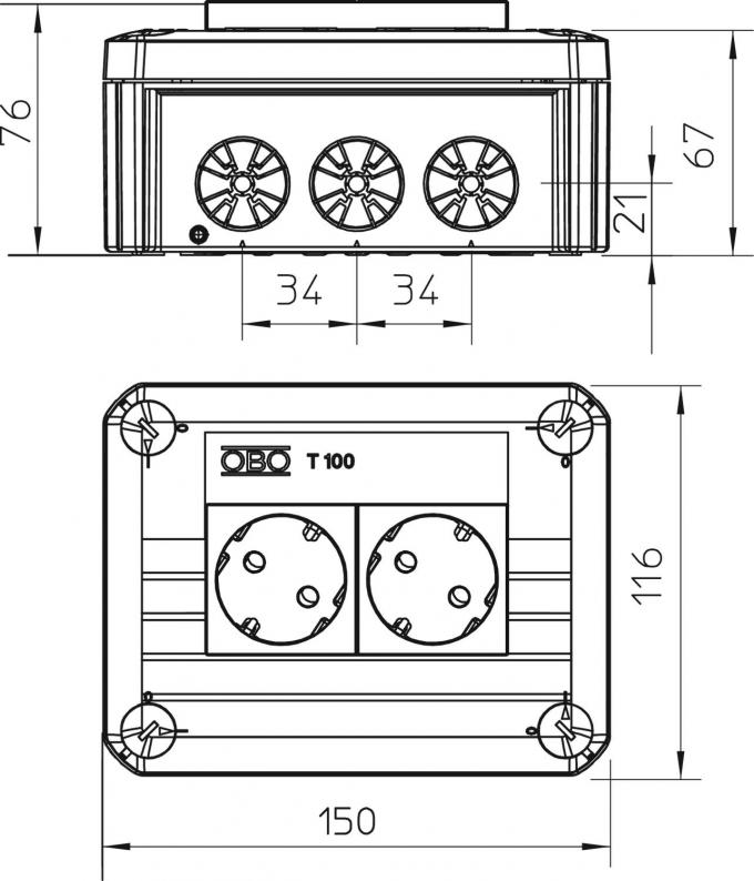 Junction box T100, 4 Modul 45 sockets in cover, 2-pinType