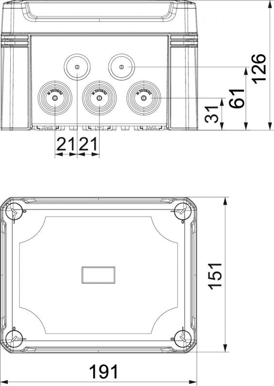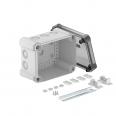 Junction box with hat profile rail for the connection of cables and lines indoors and in outdoor areas. Rectangular design with knock-out entries. Suitable for wall and ceiling mounting with the option to fasten outside, inside or to mount via the corner domes. Particularly impact resistant with IK09. Transparent cover with quick lock, sealable. Made from halogen-free and UV-resistant materials.