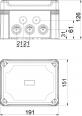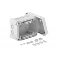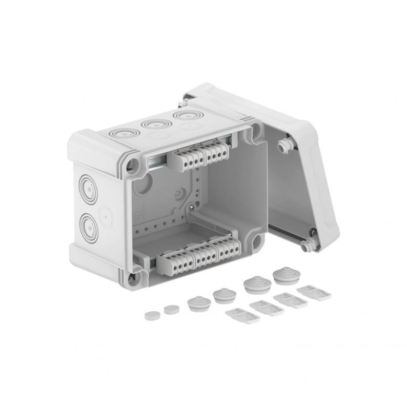 Junction box with terminal strip for the connection of cables and lines indoors and in outdoor areas. Rectangular design with knock-out entries. Suitable for wall and ceiling mounting with the option to fasten outside, inside or to mount via the corner domes. Particularly impact resistant with IK09. Cover with quick lock, sealable. Made from halogen-free and UV-resistant materials.