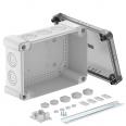 Junction box with hat profile rail for the connection of cables and lines indoors and in outdoor areas. Rectangular design with knock-out entries. Suitable for wall and ceiling mounting with the option to fasten outside, inside or to mount via the corner domes. Particularly impact resistant with IK09. Transparent cover with quick lock, sealable. Made from halogen-free and UV-resistant materials.