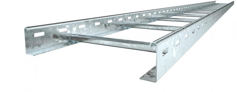 Cable ladder with a 60 mm side height with welded C30 profile rungs which are open in an upwards direction. Rolled side rail for reinforcement and as edge protection. Fastening to the bracket takes place using hold-down clamps, type LKS 40. The slot dimension of the rung is 16.5 mm and the appropriate clamp clip is type 2056.