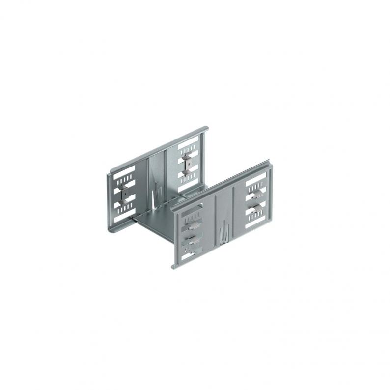 Cable tray connector with quick fastening for the screwless connection of perforated cable trays with a side height of 110 mm.