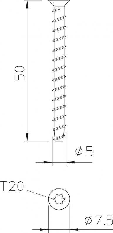 Konik-havşa başlı yangından korunmalı ankraj vidası, vida başı T20, delik 4 mm. DIN 4102 standardı uyarınca yangından korunma tekniği bakımından kontrol edilmiştir. Yangın dayanıklılık sınıfı F90'a kadar.