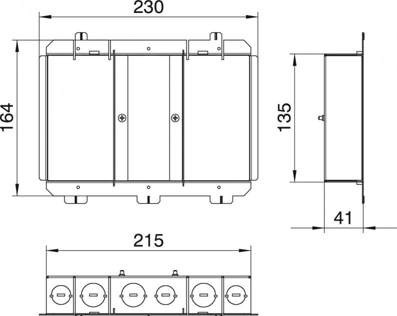 Enclosed mounting support for receiving 3 APMT2 cover plates. The mounting support is fastened below the GES6DB service outlet. Each with 6 knock-out openings M20 and M25 for the mounting of flexible installation hoses.