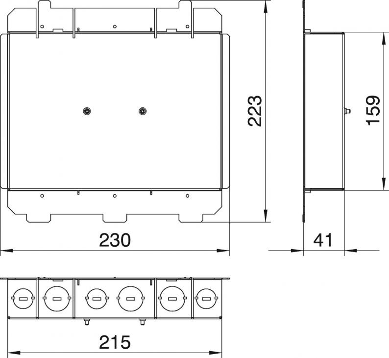 Closed mounting support for receiving 3 APMT5 cover plates. The mounting support is fastened below the GES9DB service outlet. Each with 6 knock-out openings M20 and M25 for the mounting of flexible installation hoses.