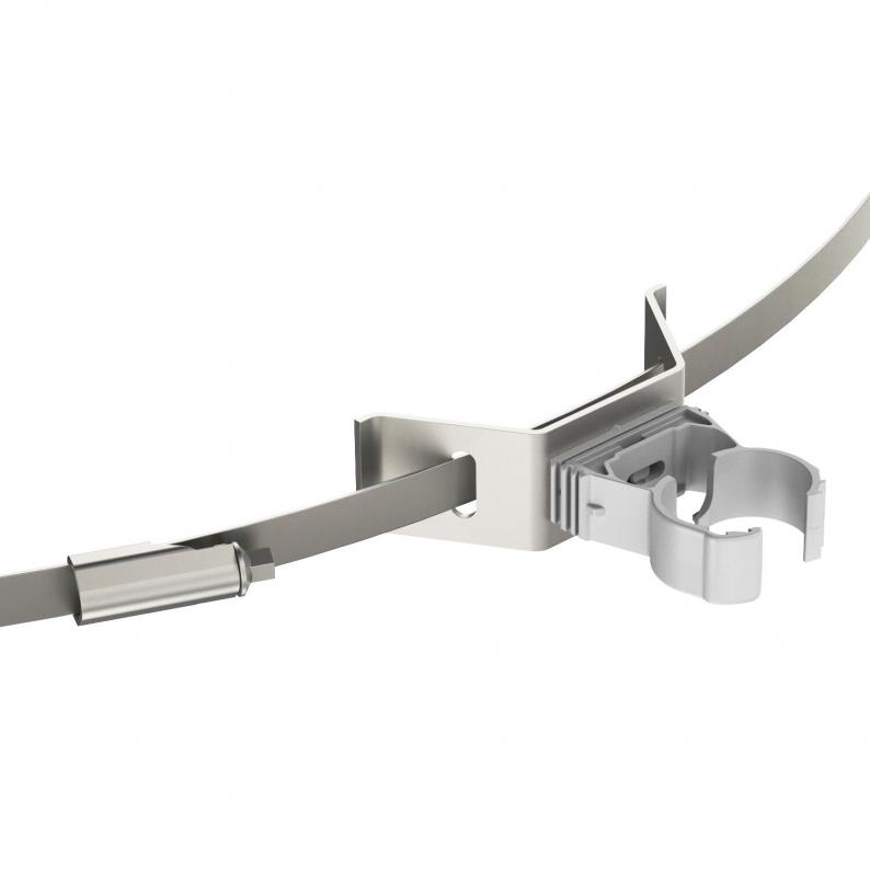 Cable bracket with tightening strap for isCon® conductor, for mounting on pipes with Ø ≤ 600 mm.