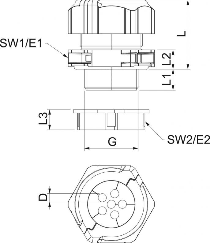 The sealing inserts are used to insert multiple cables through a gland. Depending on the application, the specified hole diameters are reduced by 1–2 mm when tightening the cable gland.