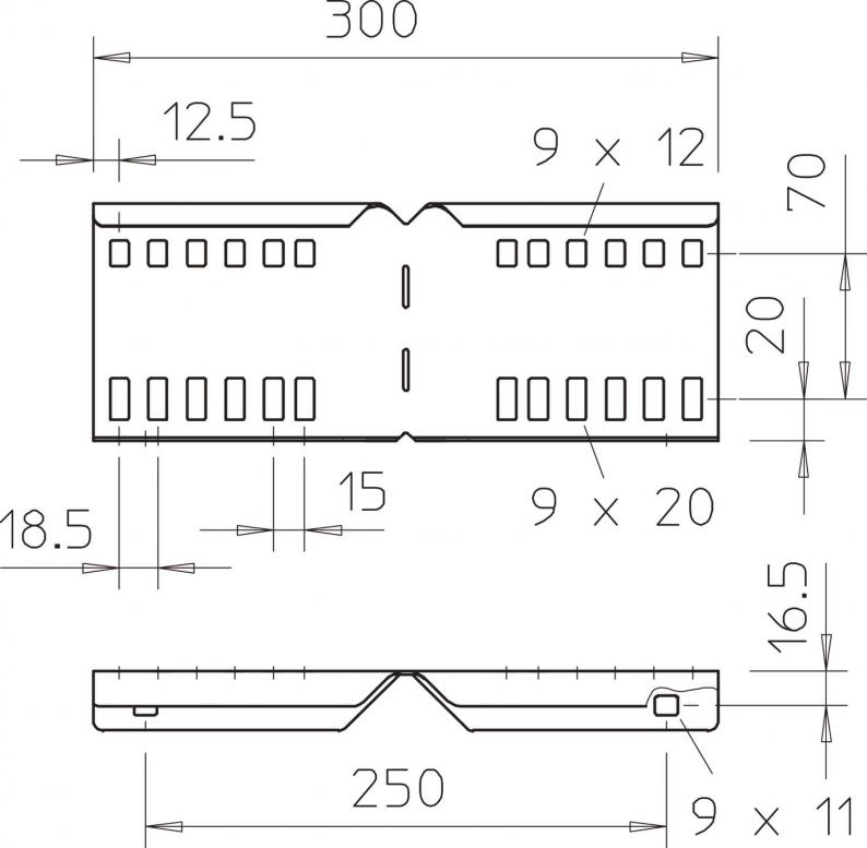 Angle connector as external connector to join cable ladders and fittings with a side height of 110 mm and continuous rail perforation.