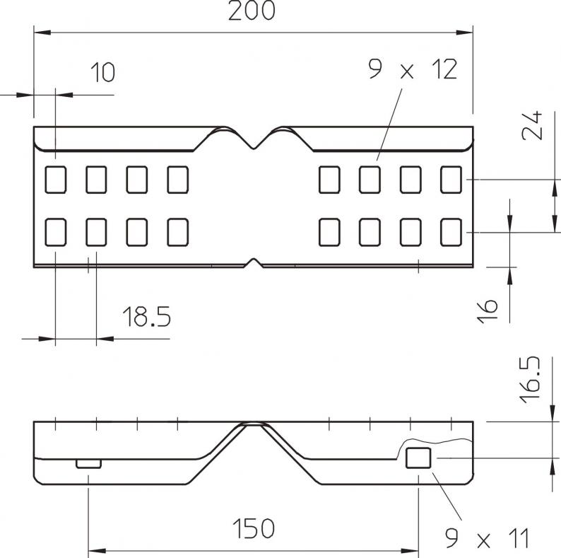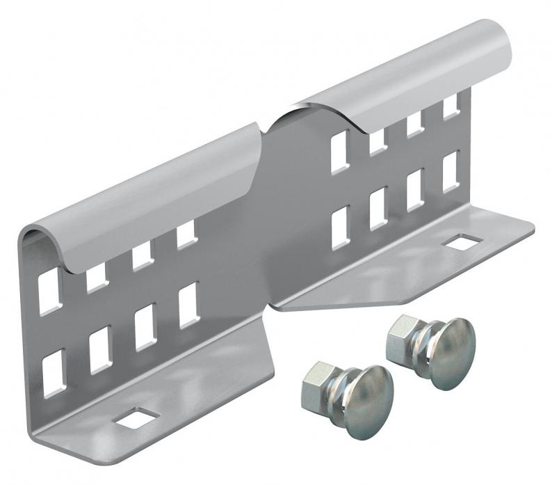 Angle connector as external connector to join cable ladders and fittings with a side height of 60 mm and continuous rail perforation.