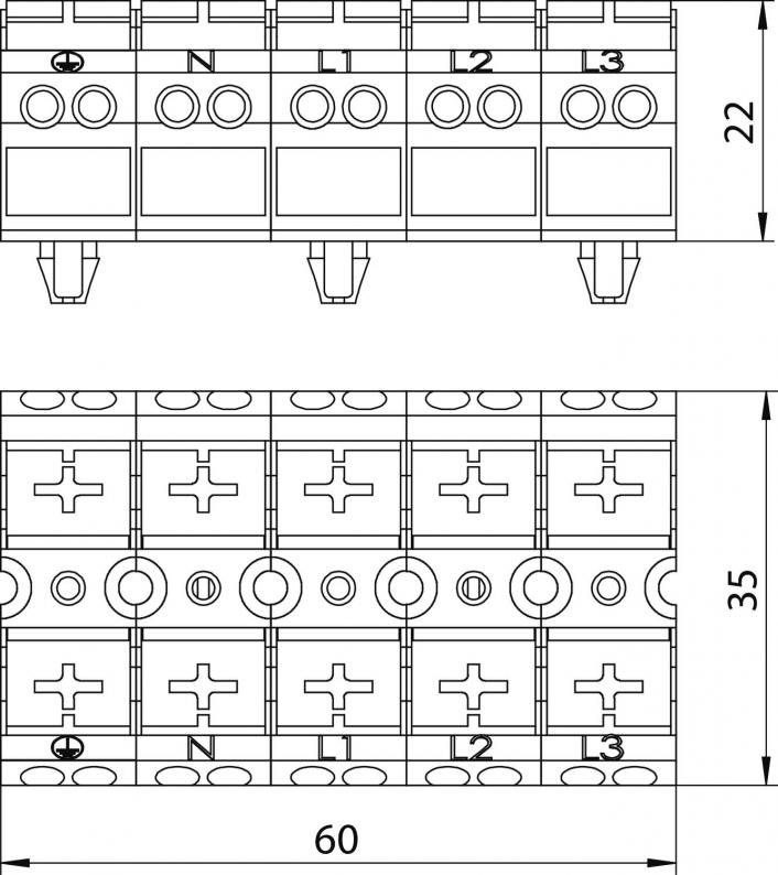 Screwless terminal strip with locking foot, 5-pin for a cable cross-section of 0.5–4 mm².